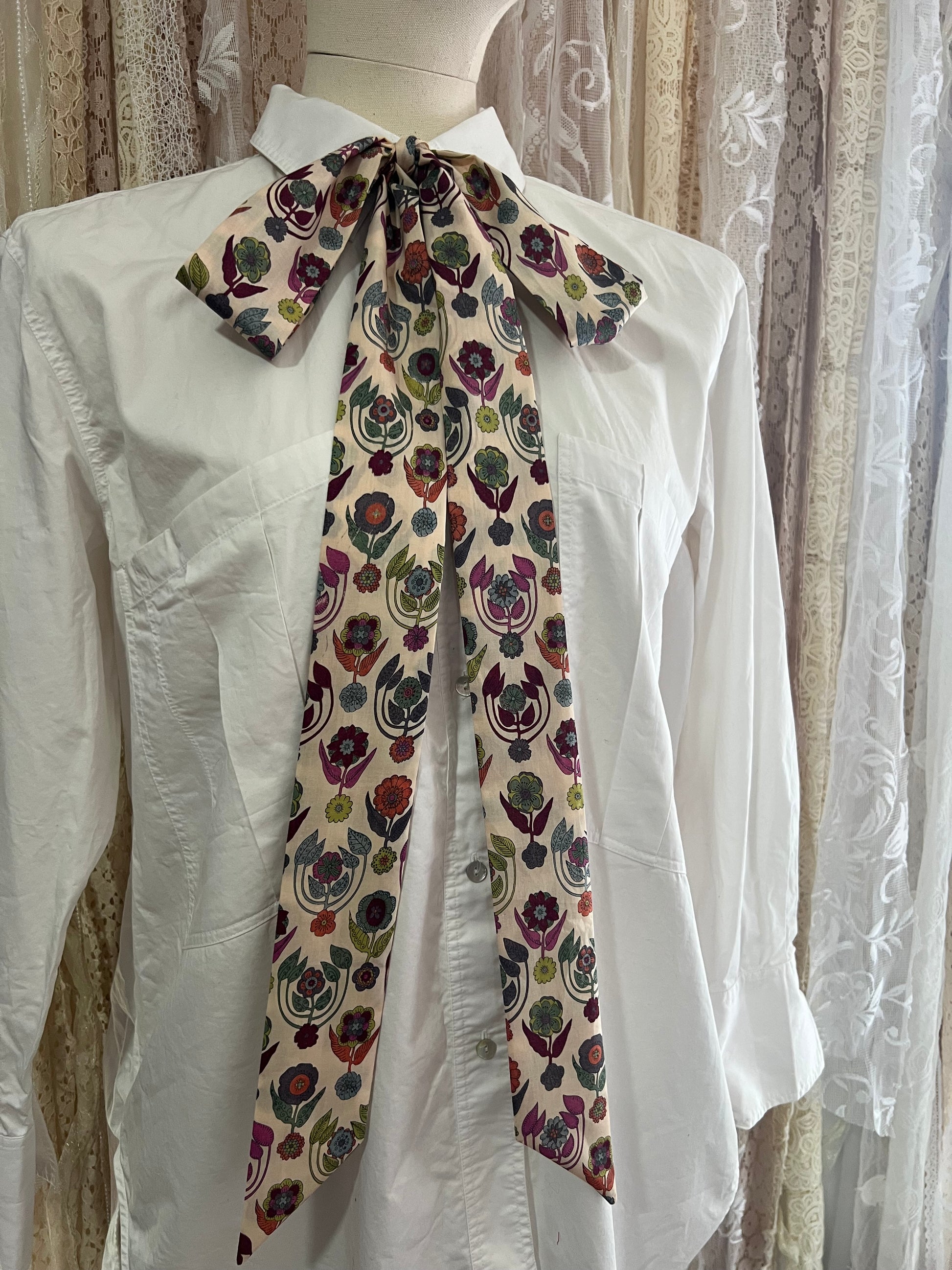 Bright, bold, and beautifully retro, this pussybow collar is made from Liberty Tana Lawn™ cotton in the vivid and graphic ‘Droxton’ print. Inspired by Art Nouveau and Scandinavian folk florals, this design features stylised blooms in jewel tones of violet, chartreuse, ruby, and teal on a soft ivory base.