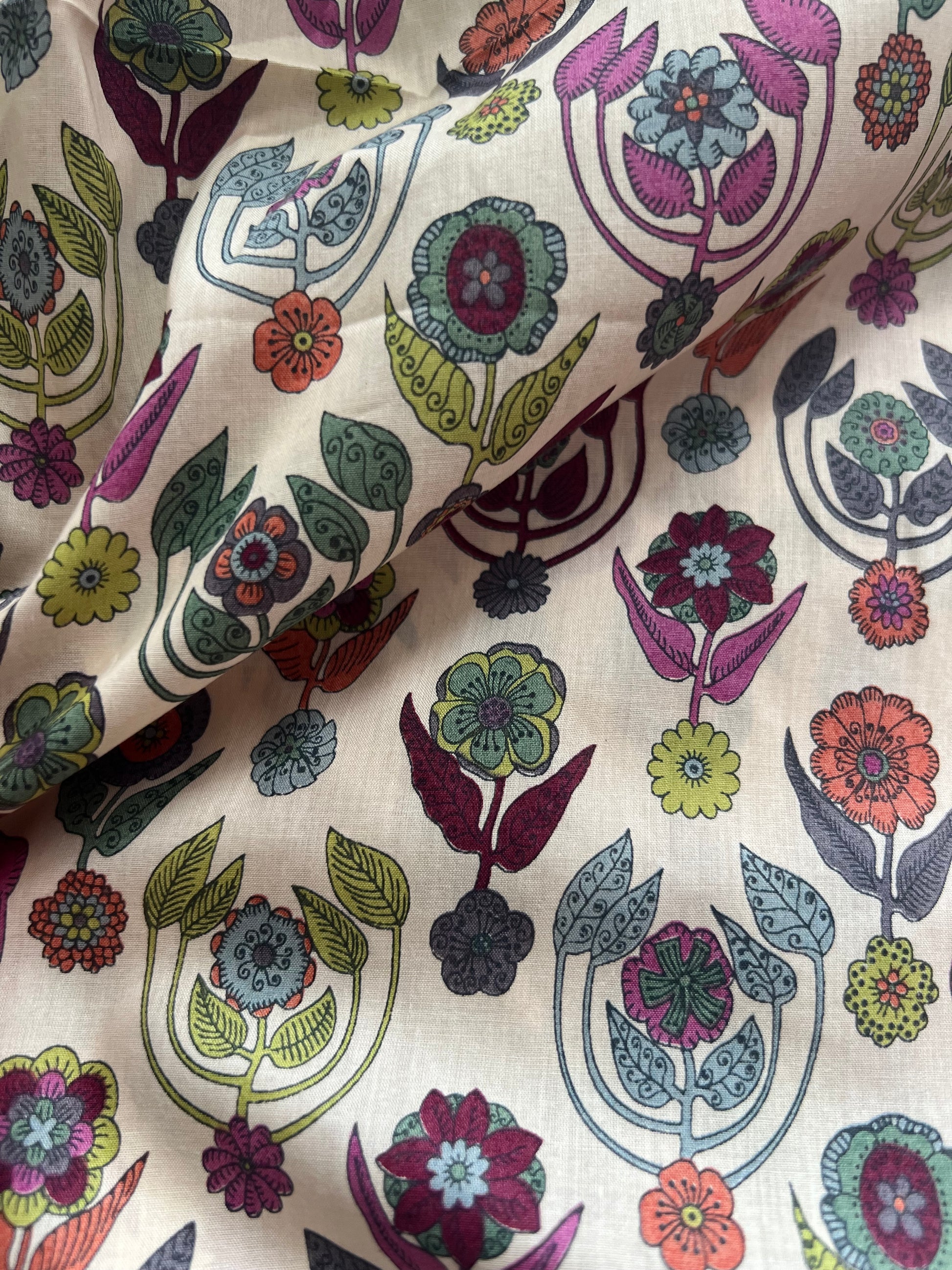 - Print: ‘Droxton’ – stylised floral in rich, vibrant colours on ivory