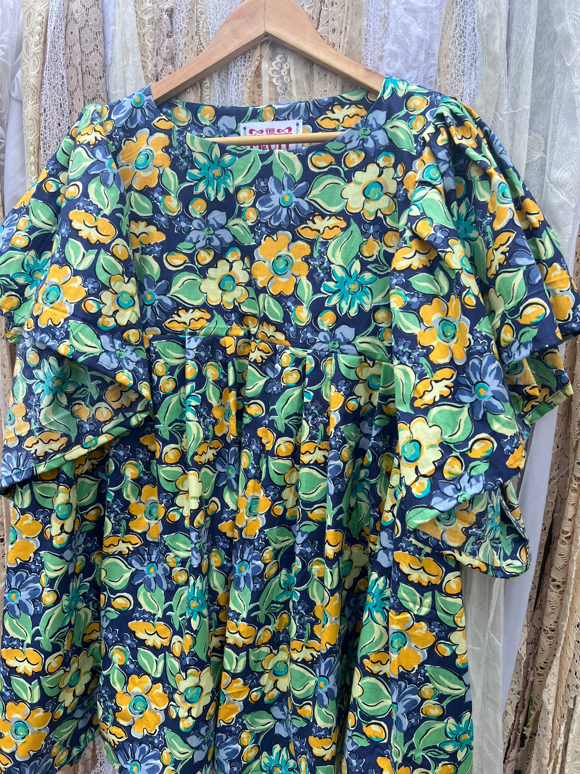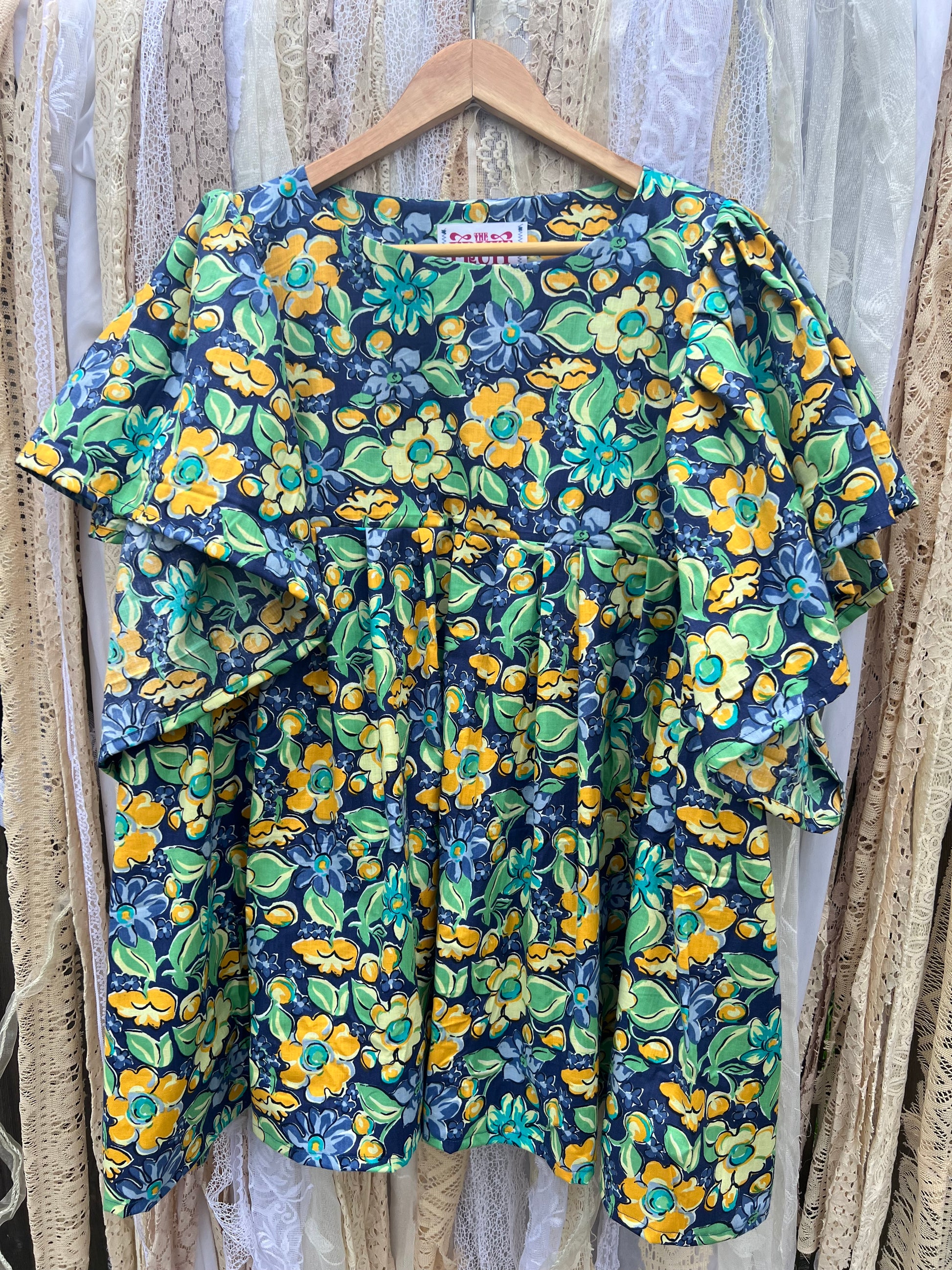 Leonie is bursting with joyful colour, a mini dress/tunic handmade from a vintage cotton covered in painterly yellow, turquoise, and green blooms on a deep navy background. The airy angel sleeves and easy, swingy shape make it just as perfect layered over jeans as it is worn alone for sunny-day adventures.
