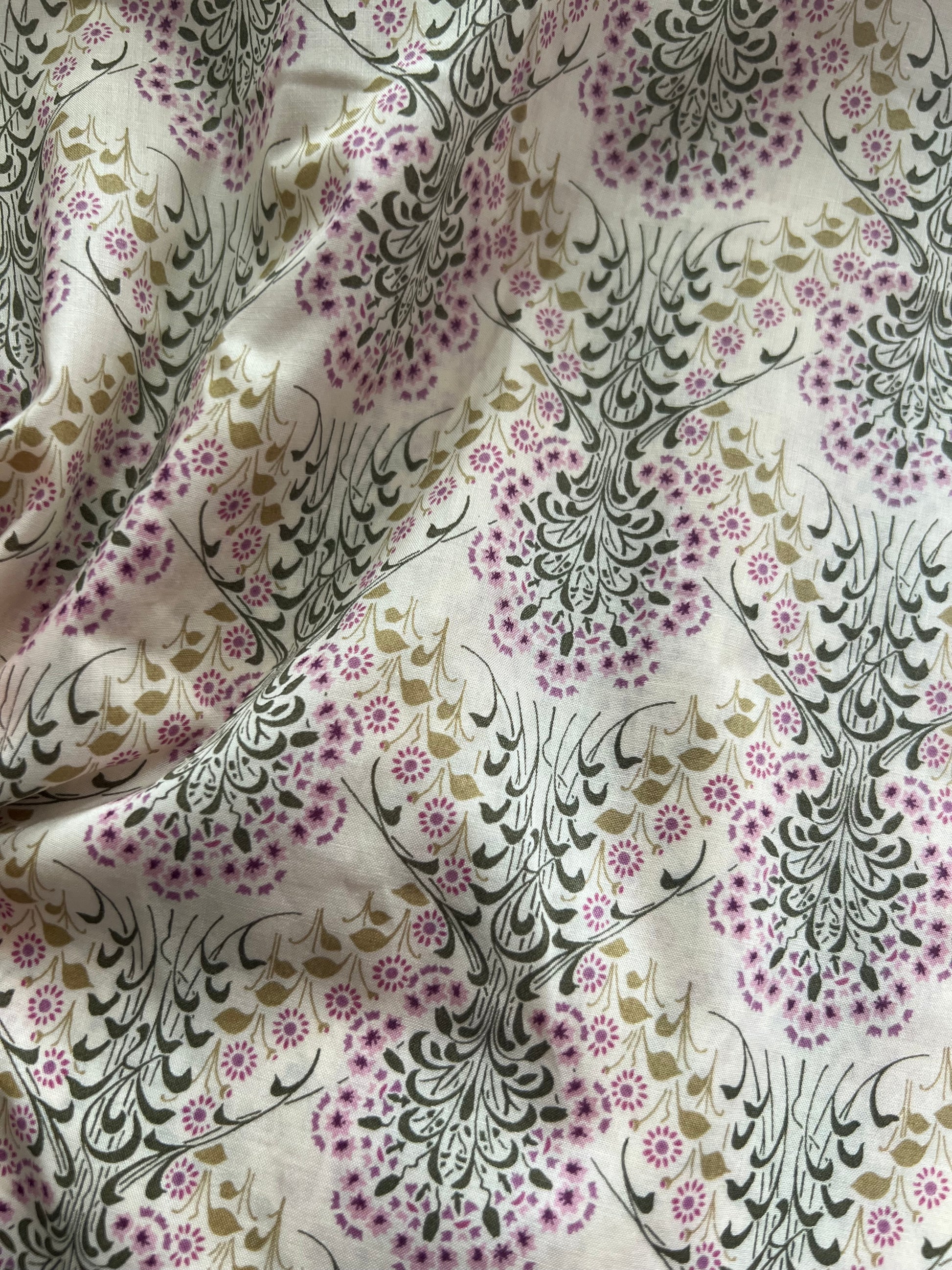- Print: ‘Little Mari’ – floral sprays in green on soft cream